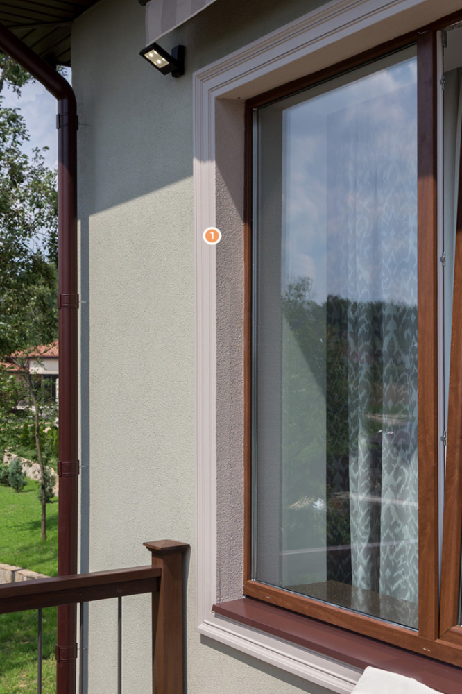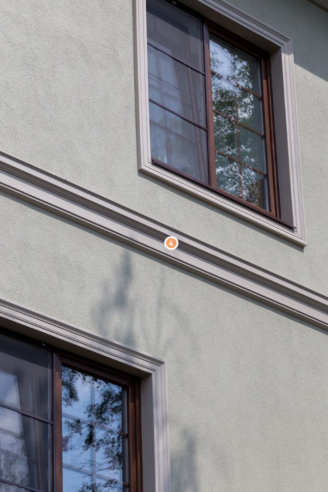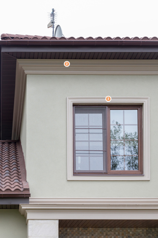 Для дизайна экстерьера частного дома в Московской области были использованы необычные цвета. Они выгодно смотрятся в сочетании с лепниной. Для обрамления окон используются карнизы, архитравы и кронштейн-пьедесталы. Перила украшены изящными балясинами, а для окна под крышей используется арочное обрамление. Дизайн самой крыши дополняется стильным карнизом.