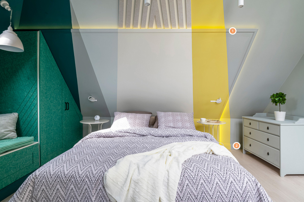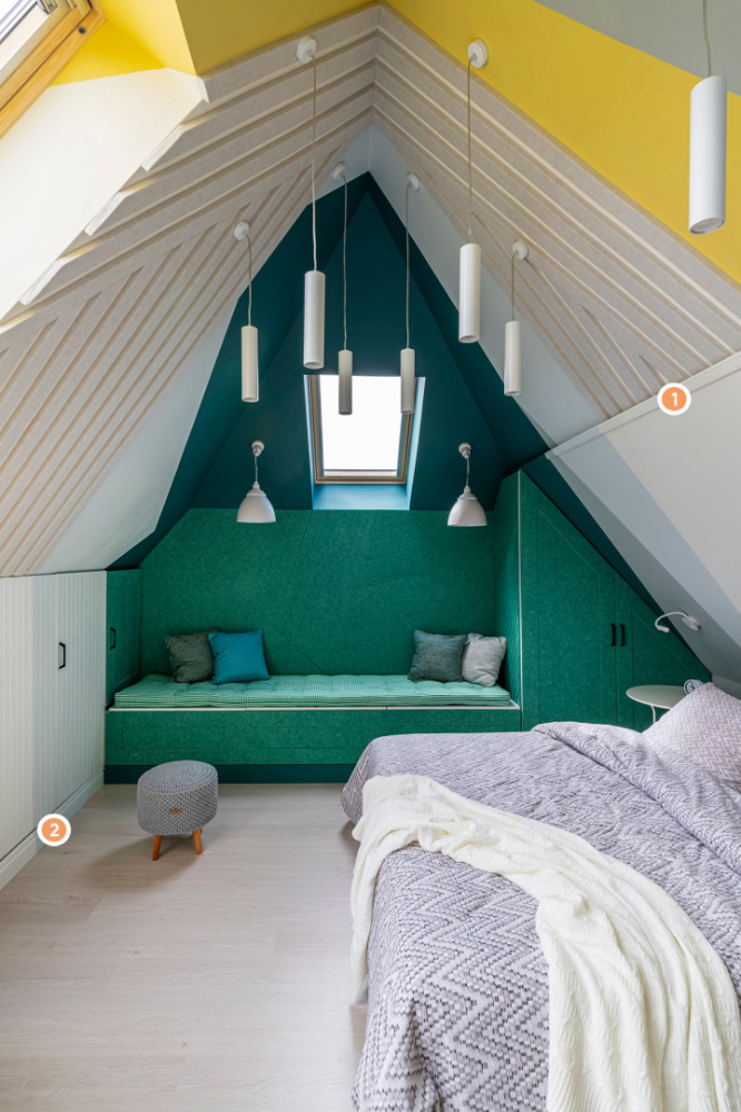 Стараниями профессионального дизайнера из мрачной и тёмной мансарды удалось создать уютное пространство для отдыха и досуга. Уникальное оформление стен сразу же бросается в глаза – при помощи краски будто бы изменили геометрию помещения. Плинтус вдоль пола и изящный молдинг на одной из стен помогают поддерживать иллюзию.