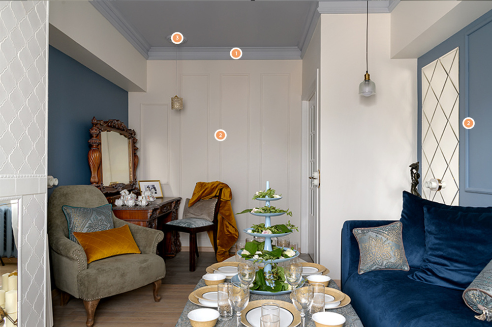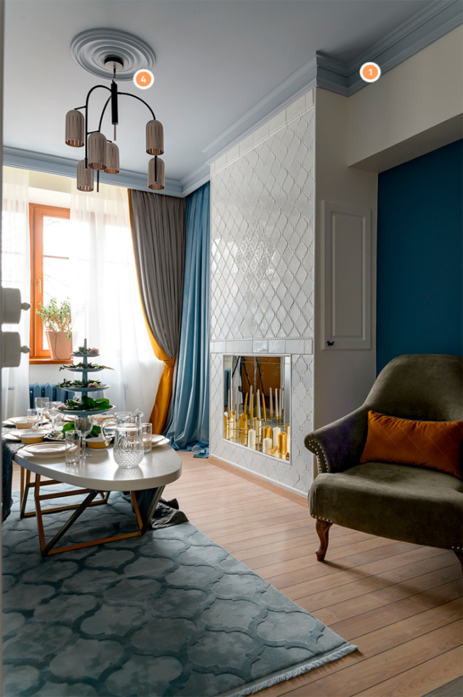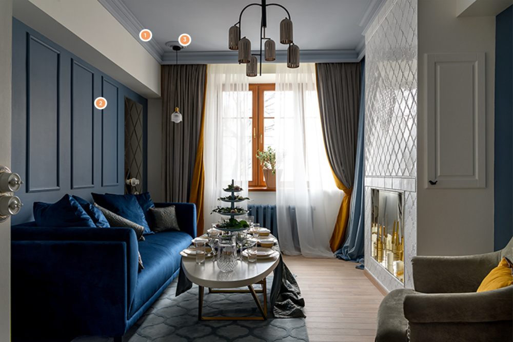 Обычная, на первый взгляд, гостиная может вызывать ощущение тайны и загадки. Подобный эффект достигается при помощи мягких тканей, соотношения цветов и, конечно же, лепнины компании «Европласт». Так, стены украшает молдинг 1.51.322. Он формирует прямоугольные рамки разных размеров, расширяя пространство и делая его более интересным. Потолочную поверхность обрамляет ступенчатый карниз 1.50.146. Ну а светильники украшены изящными розетками (1.56.013 и 1.56.035), имеющими общую идею, но разный узор.