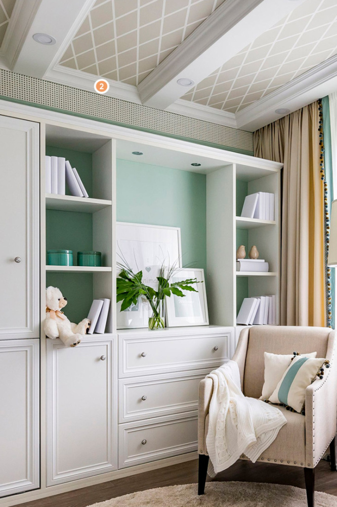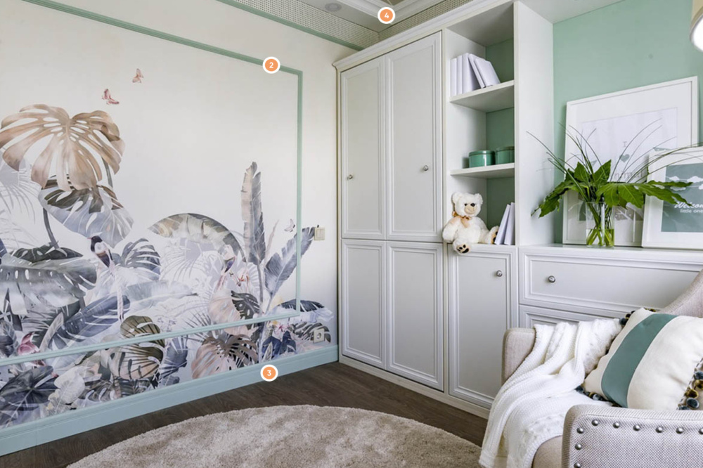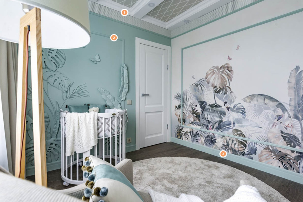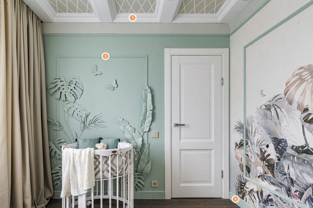 Детская комната должна быть спокойной и уютной. Именно такими получились «джунгли» в интерьере этой комнаты. Эффект спокойствия достигается благодаря грамотному подбору оттенков для рисунка, стен и лепных элементов. Цвета молдинга и плинтуса полностью совпадает с оттенком стен. Потолочные карнизы смягчают переход между стенами и потолком, делая и без того приятный интерьер, по-настоящему расслабляющим.