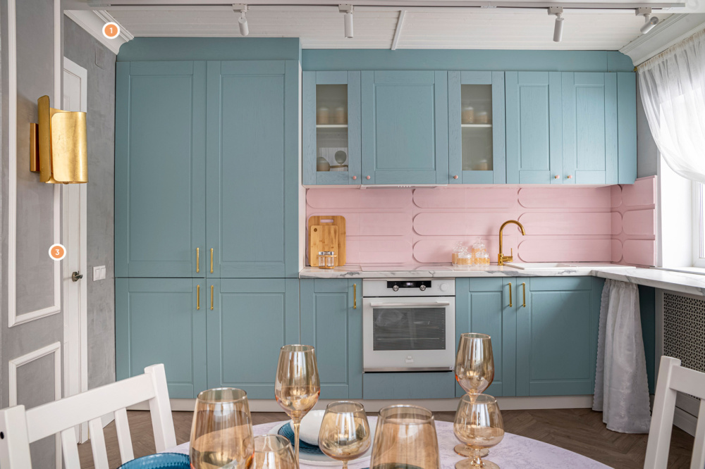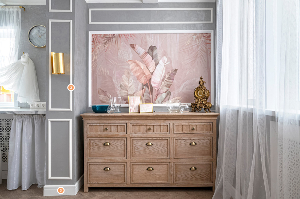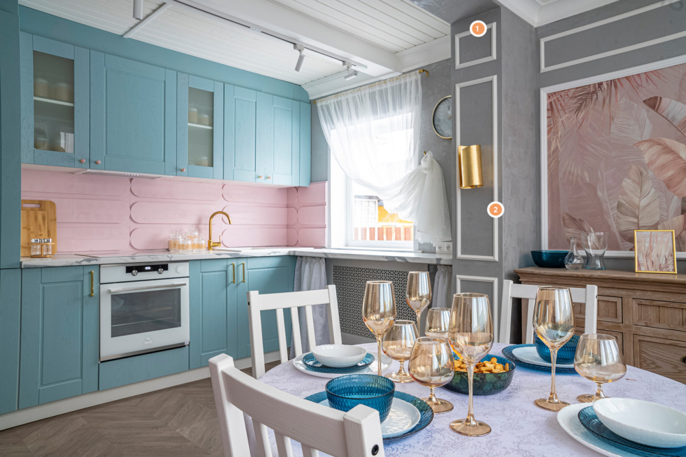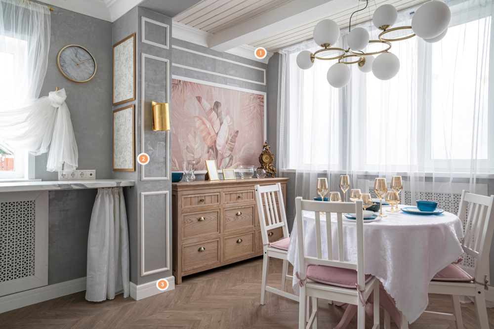 Изначально маленькая кухня обрела совсем другой вид после работы профессиональных дизайнеров. Кухню объединили с верандой и оформили в стиле французских особняков. Невесомая ткань и серые стены необычайным образом сочетаются со строгими молдингами и плинтусами. Ну а карниз с изгибом под потолком подчёркивает невесомое ощущение от тканей.