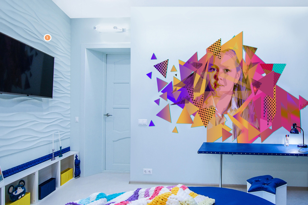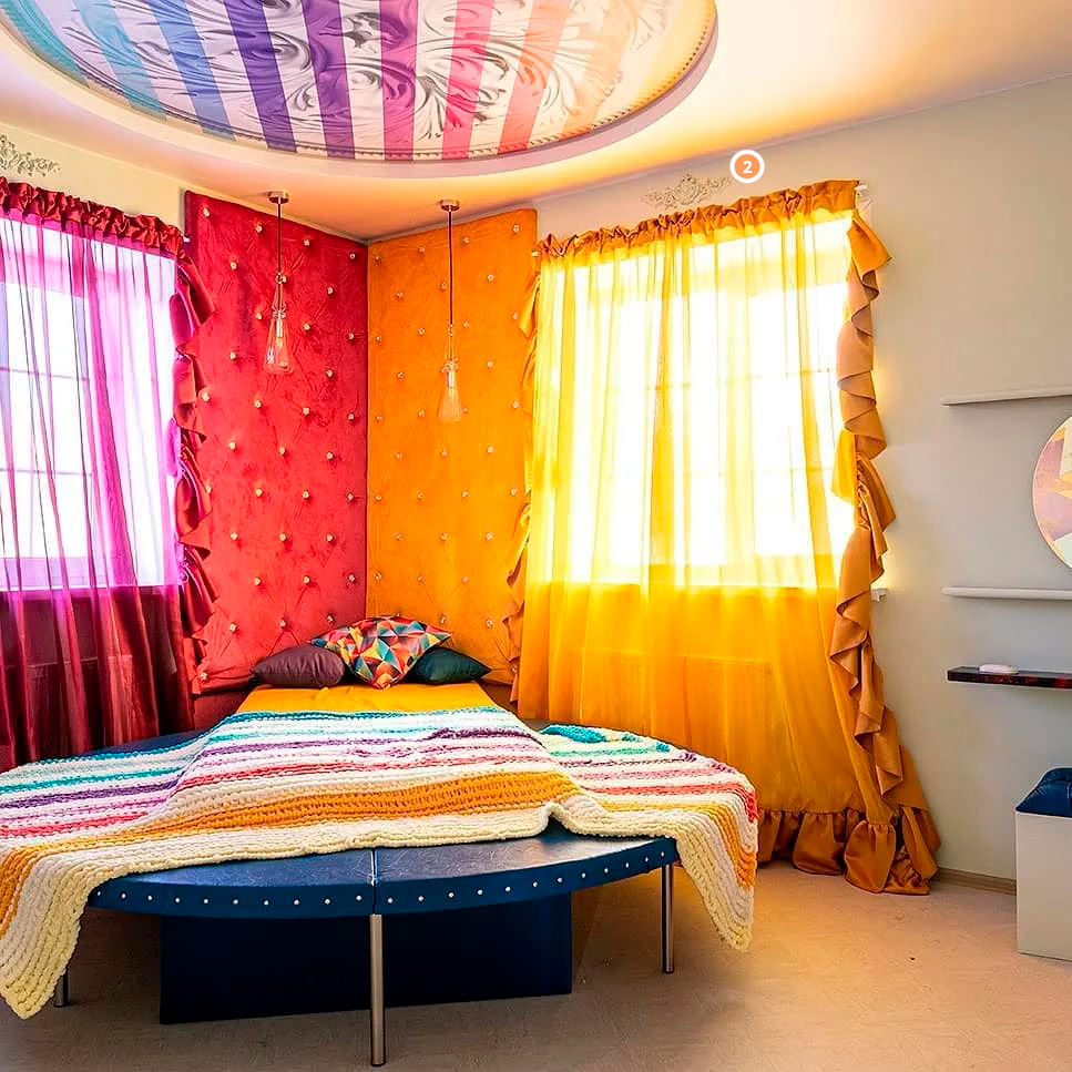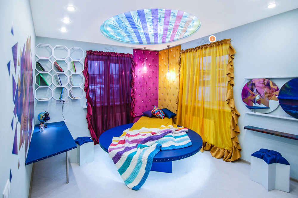 Детская комната с первым секунд удивляет яркими цветами, резкими линиями и смешением нескольких интерьерных стилей. Необычная подсветка потолка, броские ткани и невероятные оттенки помогают пробудить фантазию и раскрыть творческий потенциал ребёнка. На эту же идею играют и лепные изделия от компании «Европласт». Так, над гардинами размещены изящные орнаменты 1.60.028, а одна из стен украшена трёхмерной декоративной панелью 1.59.001. Подобная детская комната станет прекрасным пространством для игр, учёбы и отдыха.