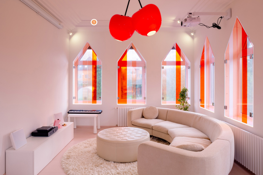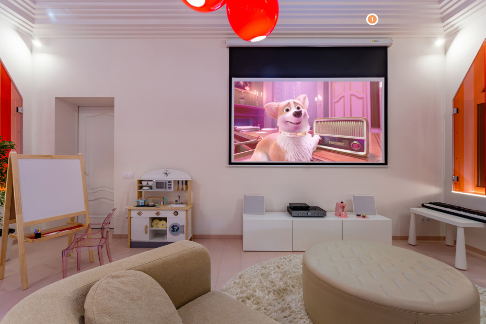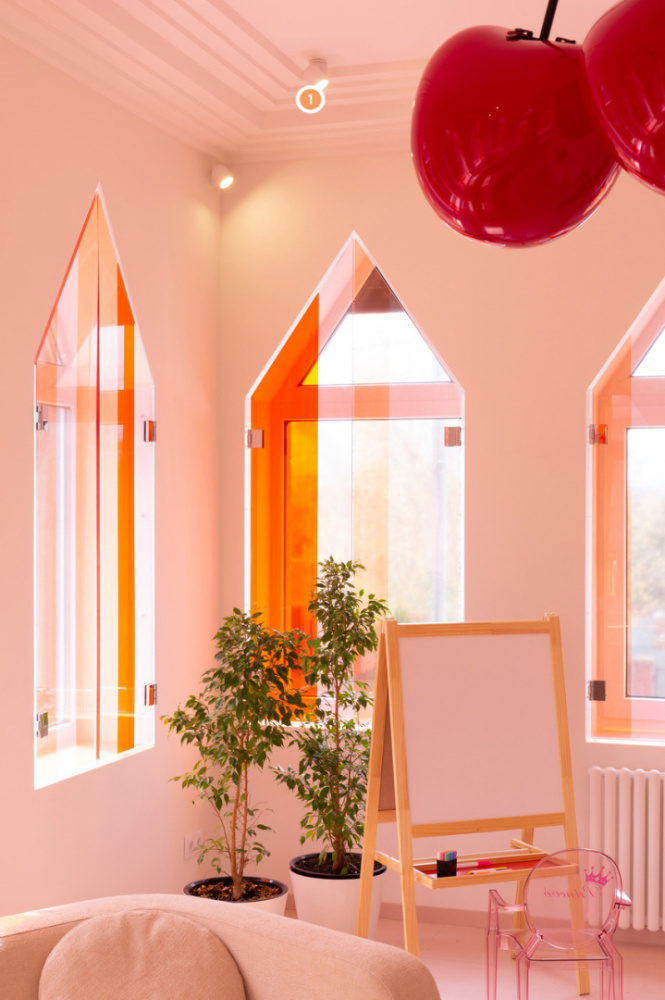 Детям нужно немало места для своих хобби и развивающих игр. Игровая комната должна быть яркой, будто бы подталкивая детей к творчеству. В дизайне комнаты сочетаются волшебные витражи, ягоды вишни под потолком и ступенчатый лепной карниз. Лепное изделие визуально поднимает потолок и дополняет узор на окнах.