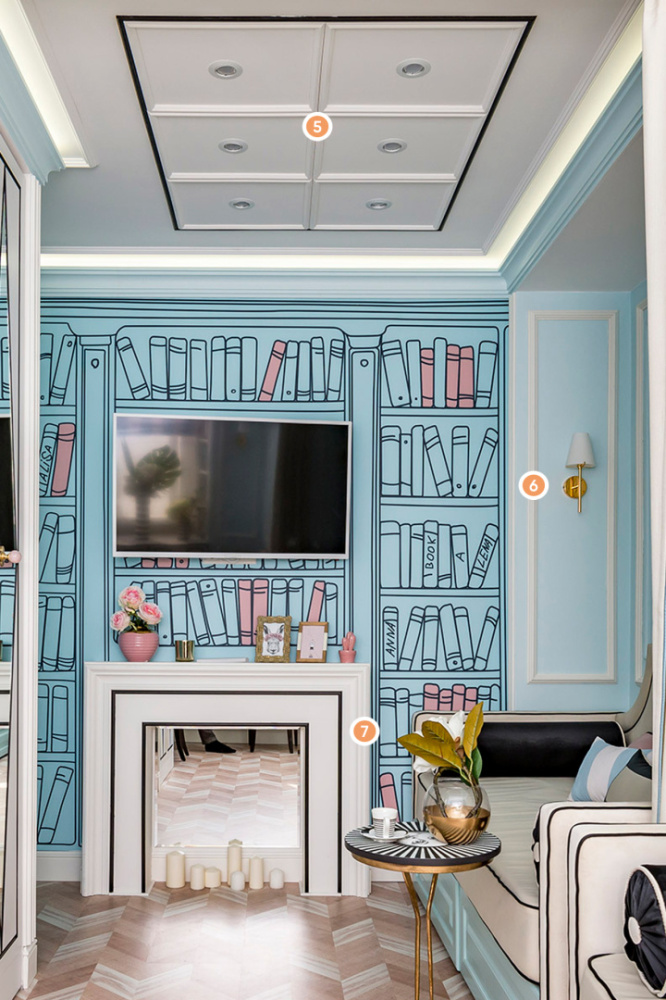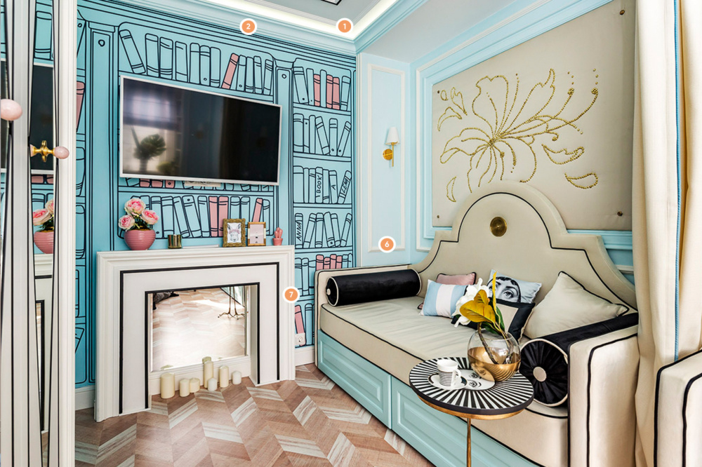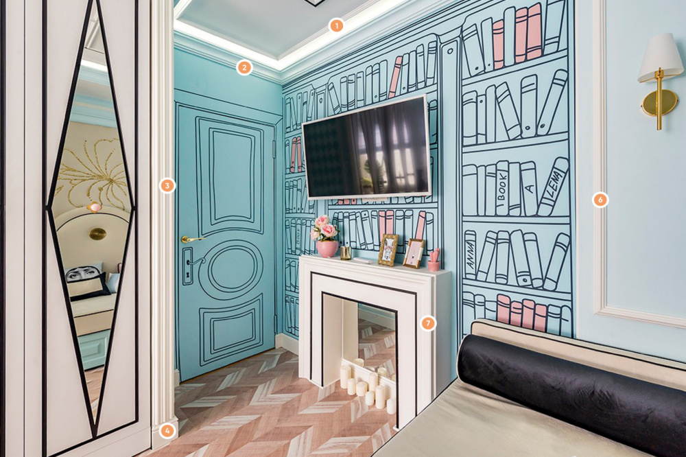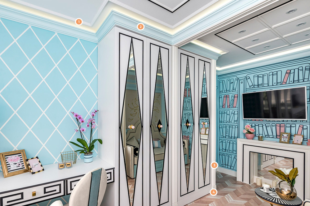 Дизайнеры этой детской комнаты поставили перед собой задачу создать яркий и позитивный мир, не занимая при этом много пространства в комнате. Узоры в виде прямых линий, отражающие поверхности и рисунки на стенах создают необыкновенную атмосферу. Но всё это не работало бы без разнообразной лепнины. Молдинги на стенах подчёркивают линии в интерьере, карниз используется для создания декоративного камина, а потолочный молдинг отделяет друг от друга светильники.