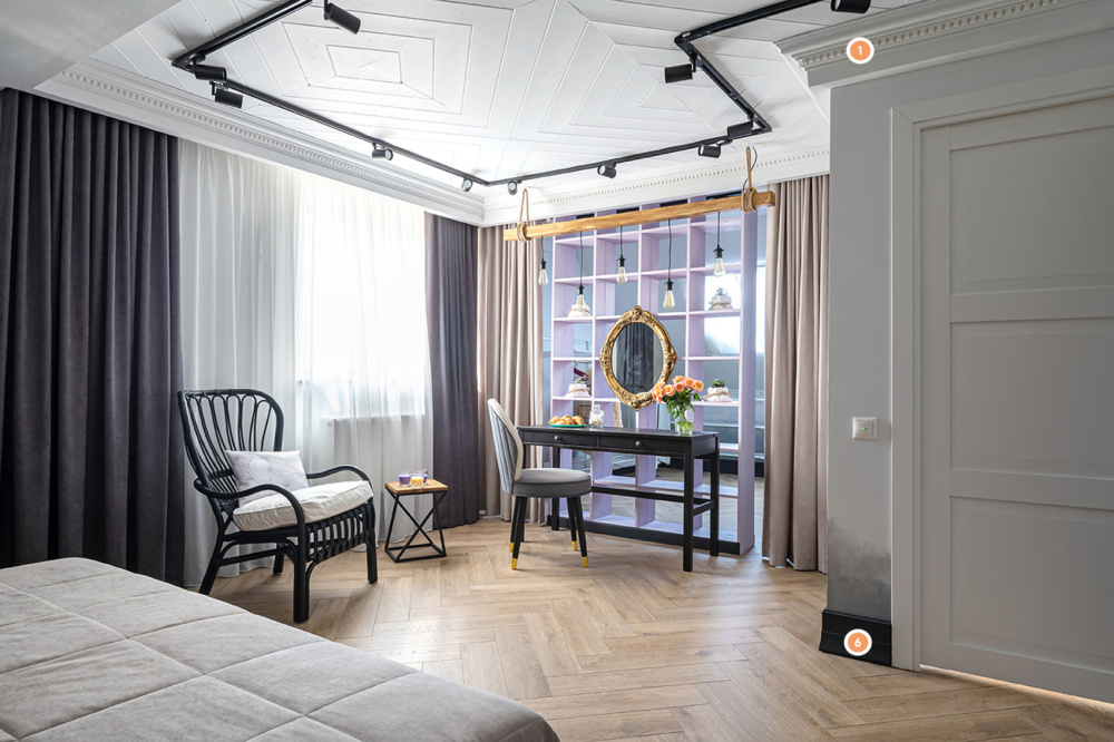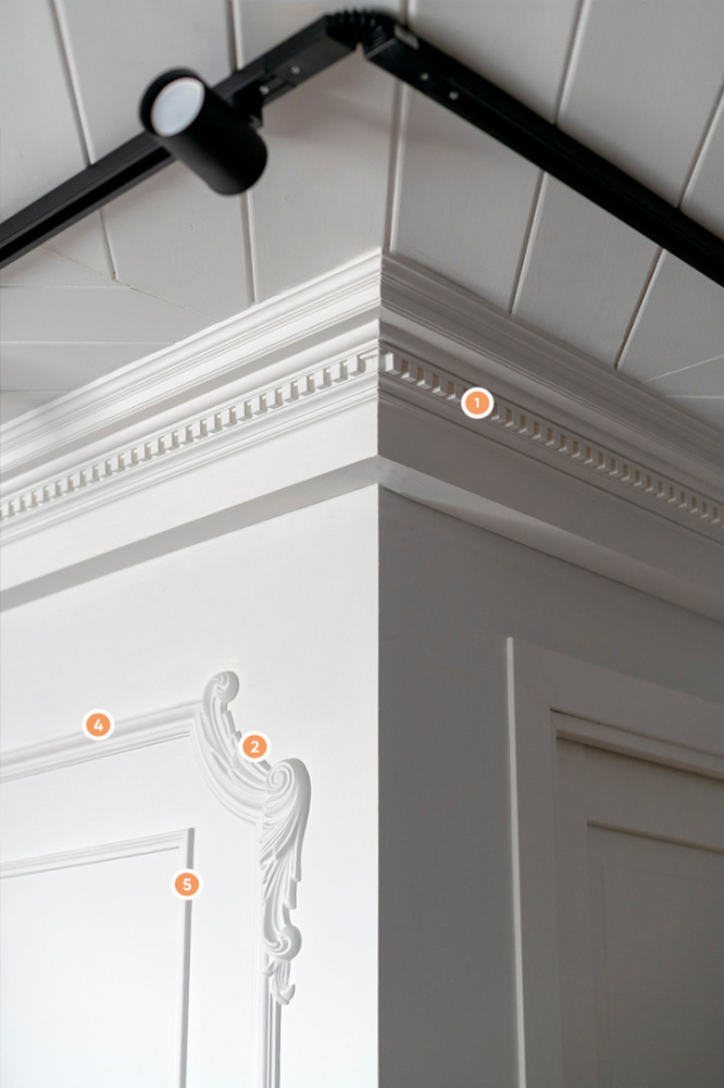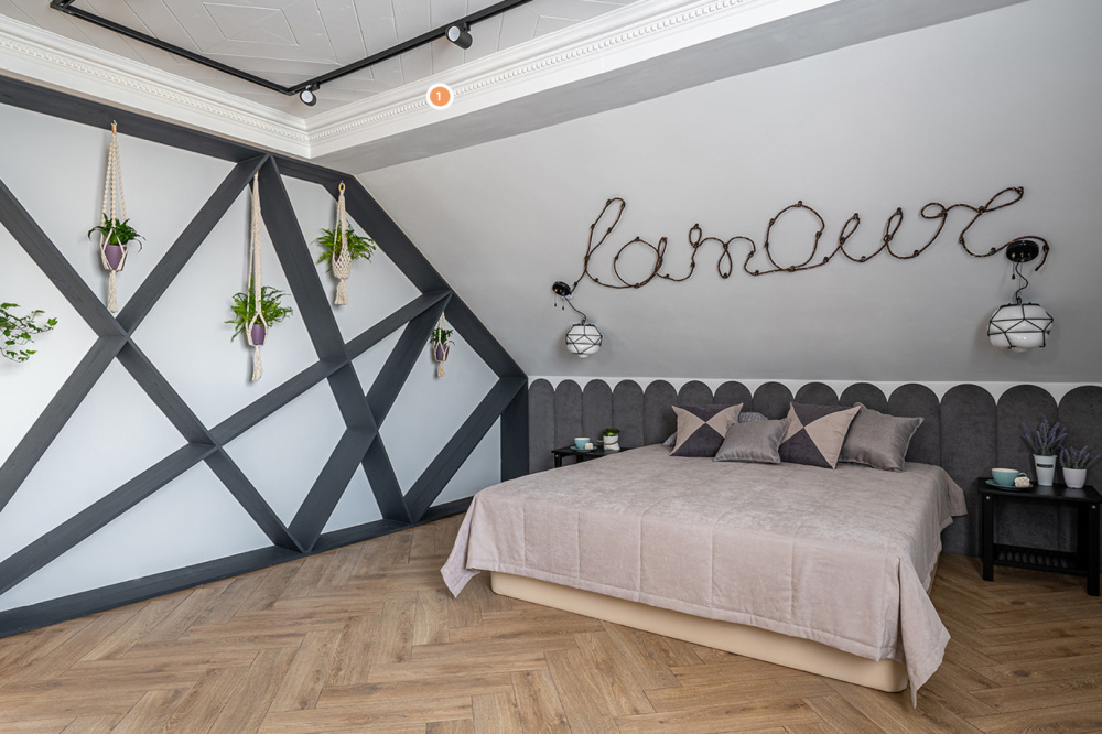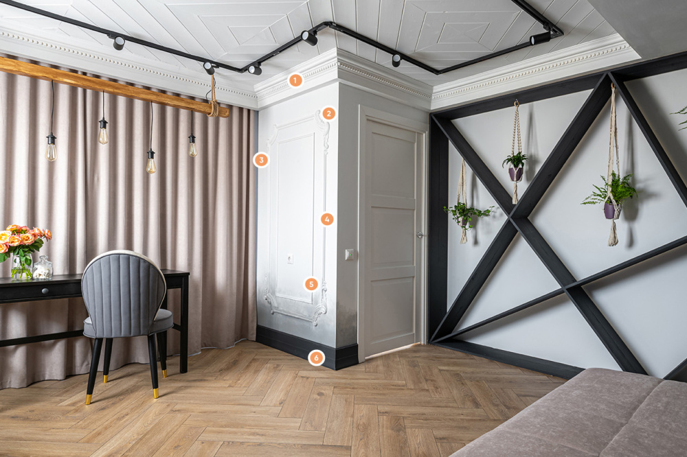 С целью сделать спальную комнату действительно необычной, дизайнеры обратили особое внимание на освещение. Потолочный свет по периметру комнаты, уютные бра над кроватью и отдельные висящие лампочки – всё в этом интерьере направлено на одну идею. Подобный дизайн нуждался в дополнении чем-то более привычным – тут-то на помощь и пришла изящная лепнина от «Европласт». Так, карниз 1.50.153 идёт вдоль всей комнаты вслед за освещением. На стенах красуются рамы, собранные при помощи молдингов (1.51.301 и 1.51.321) и угловых элементов (1.52.293 и 1.52.290). А напольный плинтус 1.53.105, в свою очередь, перекликается с хаотичной настенной конструкцией.
