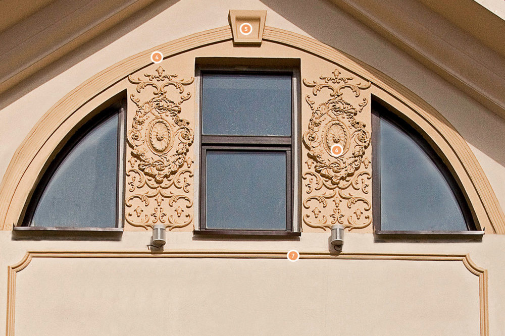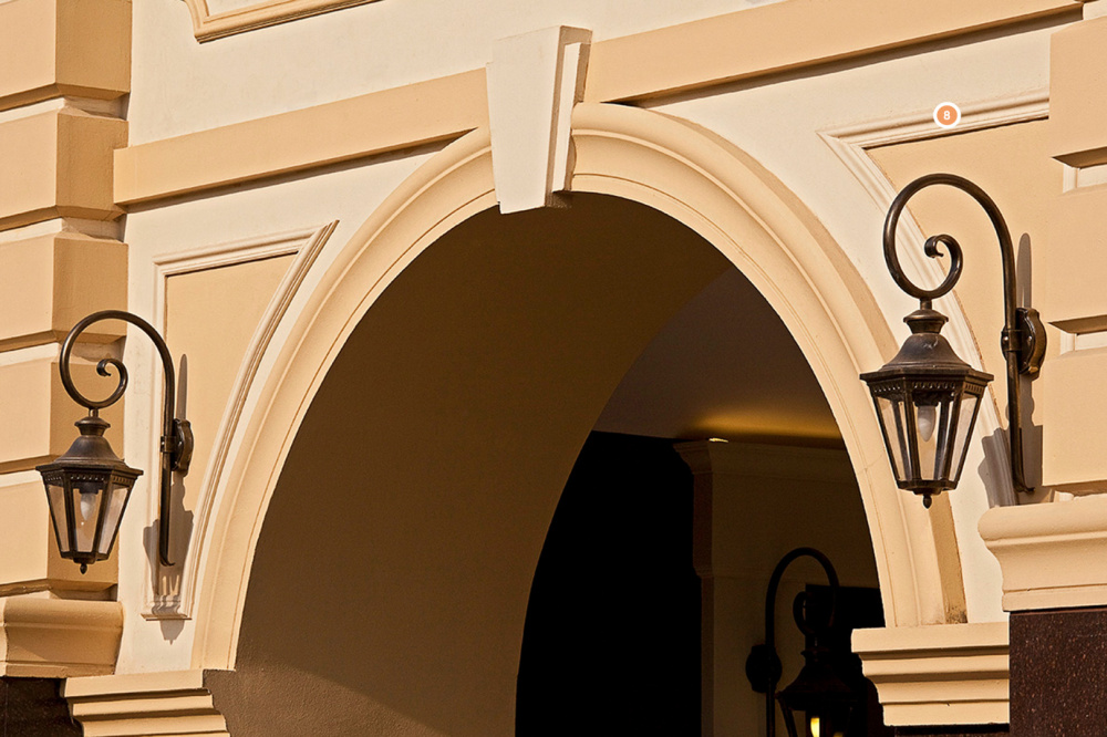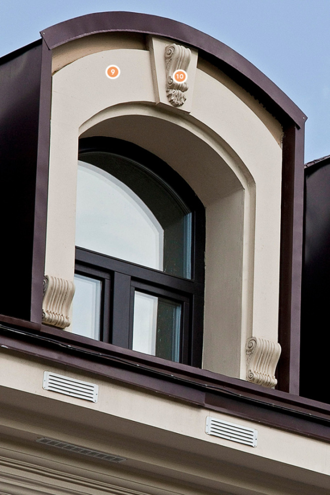 В дизайне фасада бизнес-центра «Цветной бульвар» нашлось место множеству лепных изделий «Европласт». Все они смотрятся гармонично и дополняют друг друга. Так, молдинг 1.51.302 подчёркивает формы строения строгими линиями. Схожую роль выполняет подоконный элемент 4.82.001 и лаконичный руст 4.86.001. В качестве роскошного декора с детальным узором применяется розетка 1.56.029 и кронштейн 1.19.002. Центральную роль дизайна играют полуколонны, собранные из капители 1.15.002 и ствола 1.16.020. Завершает необычную композицию наличник 4.84.001, замковый камень 4.85.011 и фриз 4.33.202.