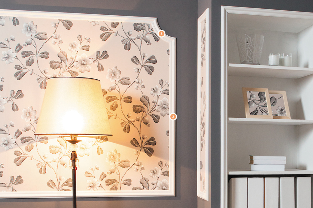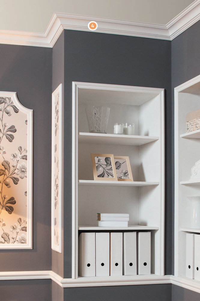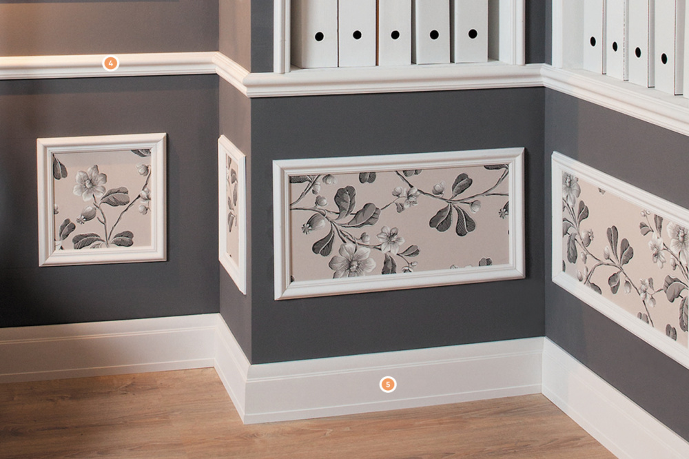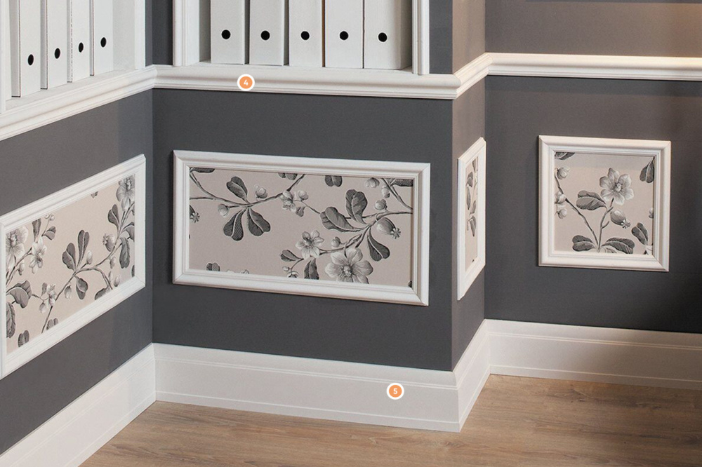Кабинет должен быть строгим и мрачным? Этот интерьер говорит об обратном! Комфорта в кабинет добавляет цветочный рисунок, который обрамлён в рамку из молдинга 1.51.301 и углового элемента 1.52.301. Этим же плинтусом оформлены и полки для бумаг. Высокий плинтус 1.53.102 и карниз 1.50.113 помогает сделать кабинет просторнее. Молдинг 1.51.302, идущий по стене, усиливает этот эффект и изящно завершает дизайн. При помощи лепного декора от компании «Европласт» скучный кабинет преобразили в место, куда хочется возвращаться.